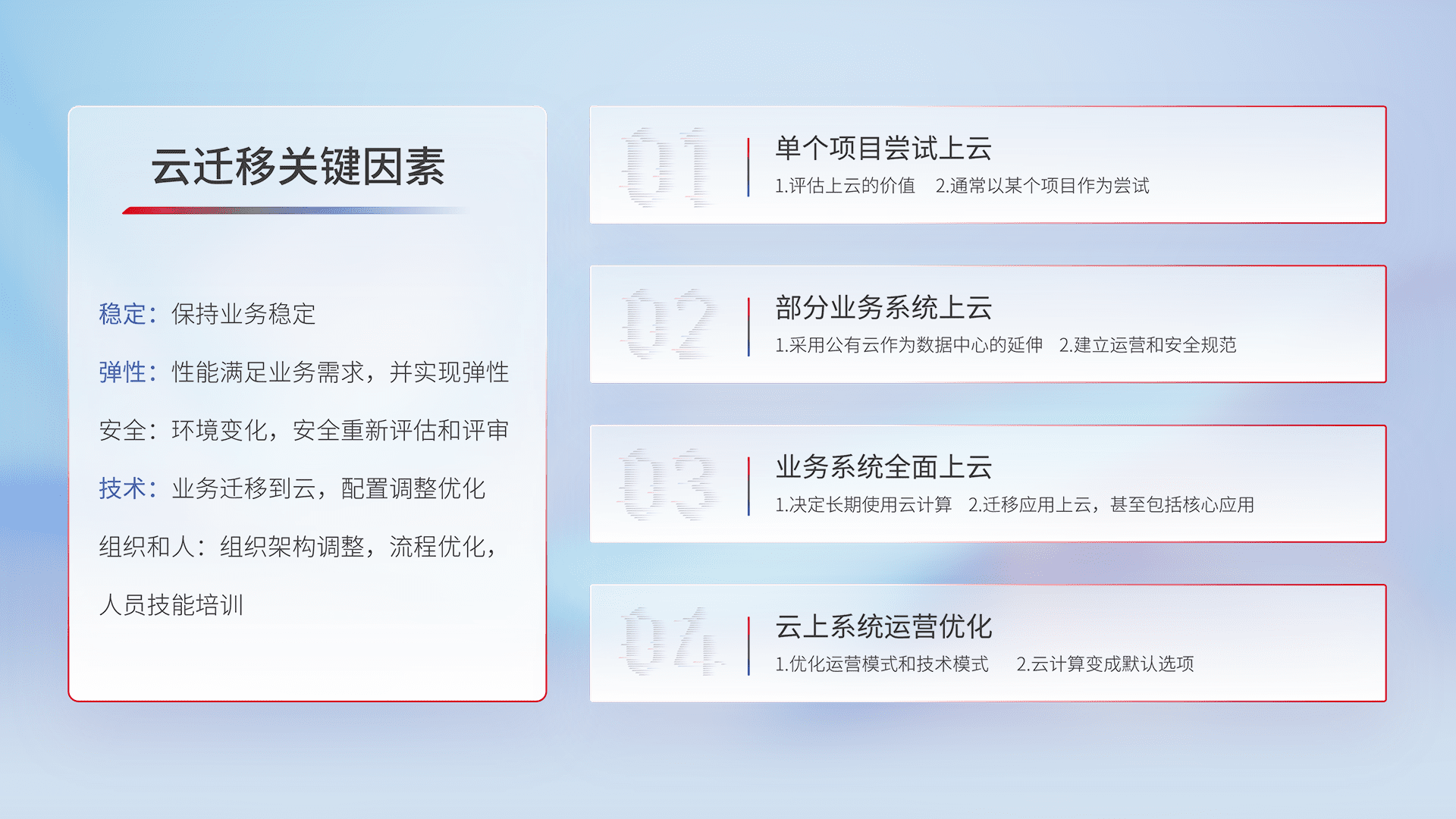 结合实际业务,,从规划设计、、、云平台选型、、云原生改造、、、、数据迁移、、集成交付,,迁移全过程为客户识别最佳上云路径,,做好风险识别管理,,设计网络架构、、、、身份权限、、、、安全审计合规、、操作审计、、日志审计、、、、监控告警策略、、、、多站点容灾设计等,,,对云上基础设施进行整体规划,,,,提升IT治理水平,,,,以满足弹性、、高可用、、高性能的需求。。。