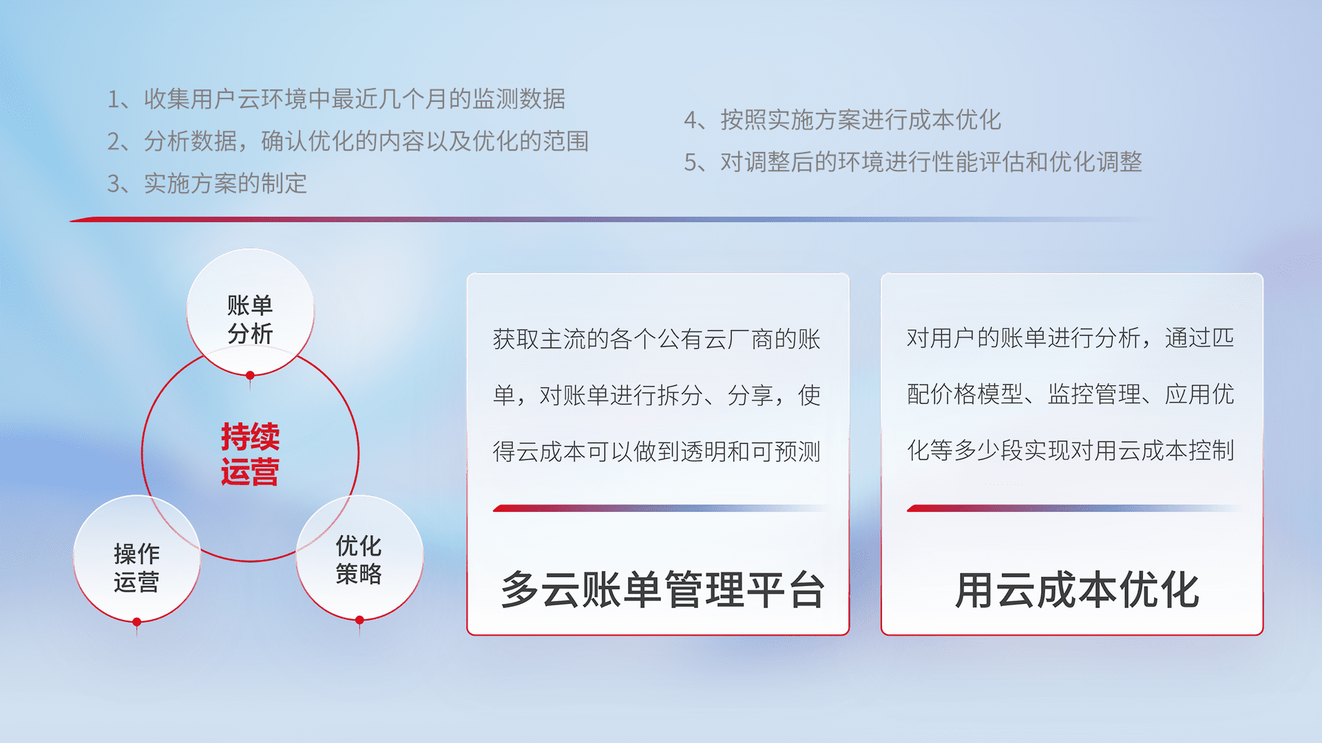 通过多云纳管,,,以统一的资源数据模型把客户的云资源进行抽象和封装,,,进而实现对多云资源的统一操作,,保障云资源管理的可靠性、、、、稳定性与可用性。。。量身定制化运维内容,,,配置、、开发运维、、、、补丁管理、、、、备份、、、监控、、、认证和访问管理、、、审计和日常巡检等,,保障在用云过程中的可靠度,,稳定度以及高可用率。。。。